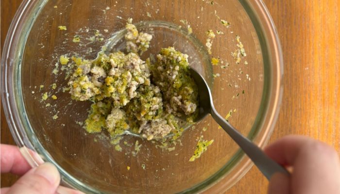 解凍したポークとお野菜の団子を軽くほぐし、すりおろした梨を加えて混ぜます。