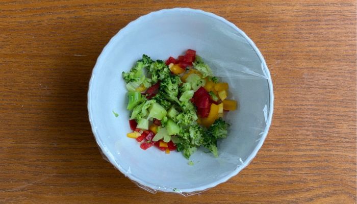 パプリカ・ブロッコリーを小さく刻み、軽くレンジで加熱(30秒〜1分)