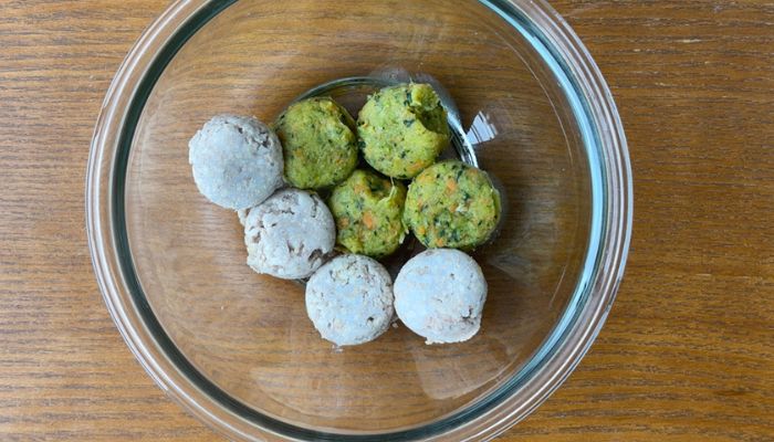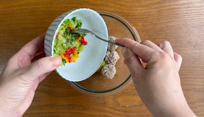 「チキン」と「βカロテン野菜」を解凍し、フォークでほぐす