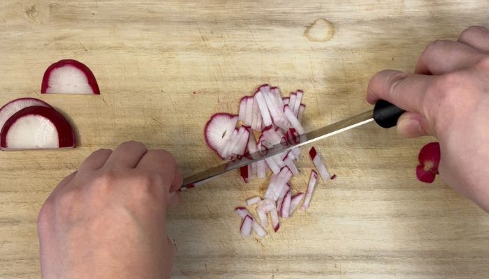ラディッシュを薄めの半月切りにします。(5mm角でもOK!彩りがきれいに出ます)