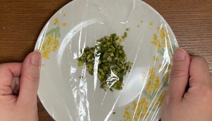 アスパラを細かく刻み、レンジで40秒加熱します。