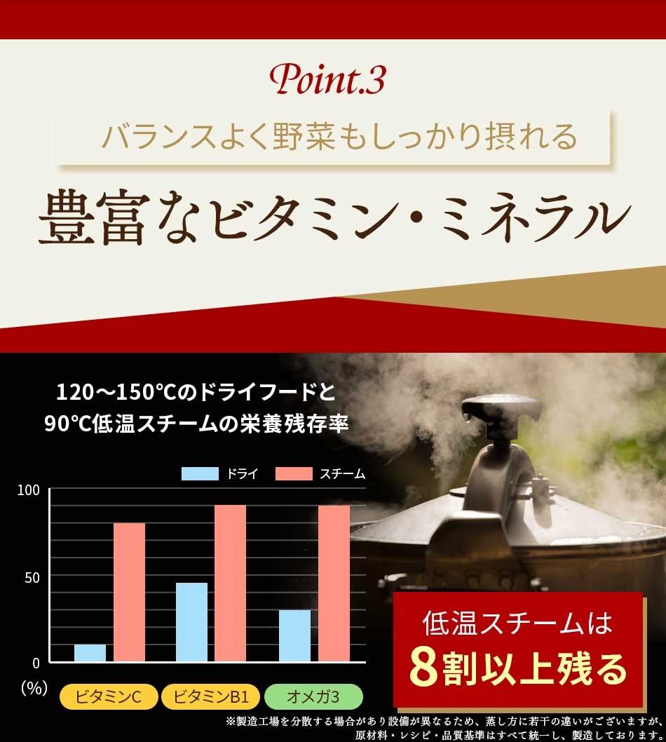 着色料などを一切使用していないため、野菜やお肉・お魚本来の色がそのまま表れます。