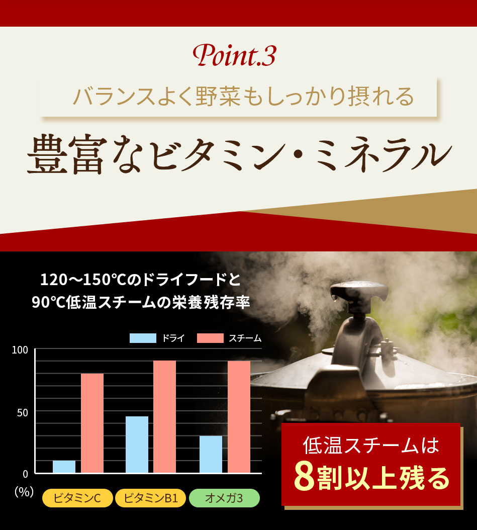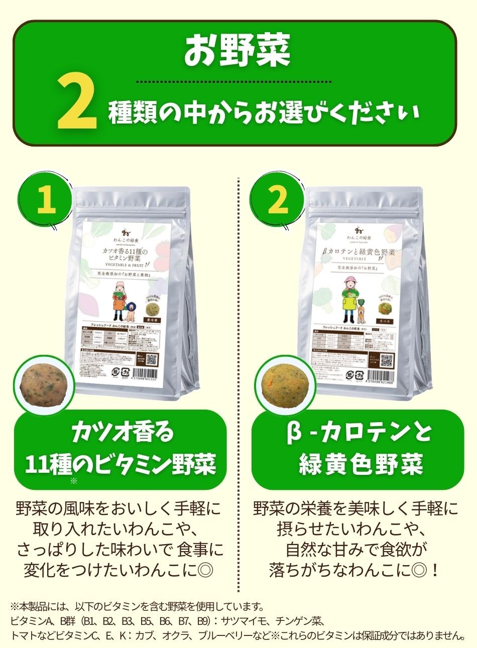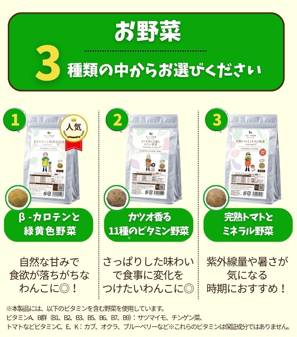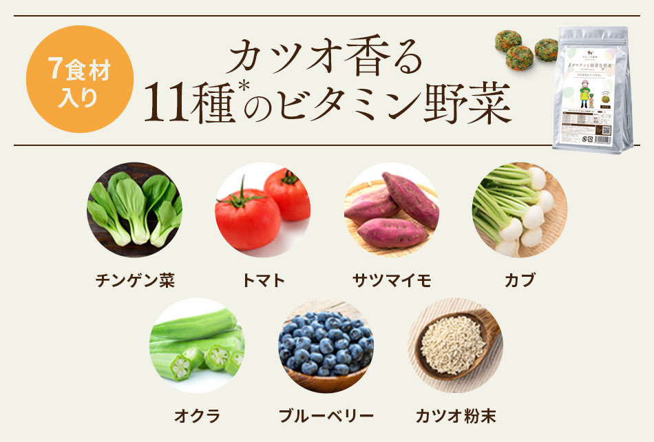 | カツオ香る11種のビタミン野菜 | チンゲン菜・トマト・サツマイモ・カブ・オクラ・ブルーベリー・カツオ粉末 |