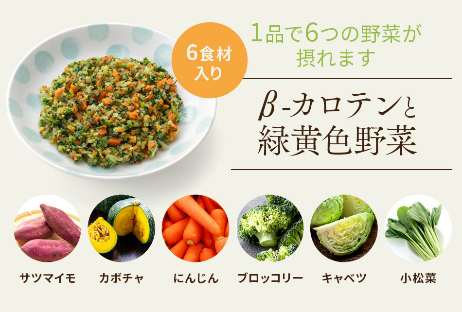 | βカロテンと緑黄色野菜 | サツマイモ・カボチャ・にんじん・ブロッコリー・キャベツ・小松菜 |